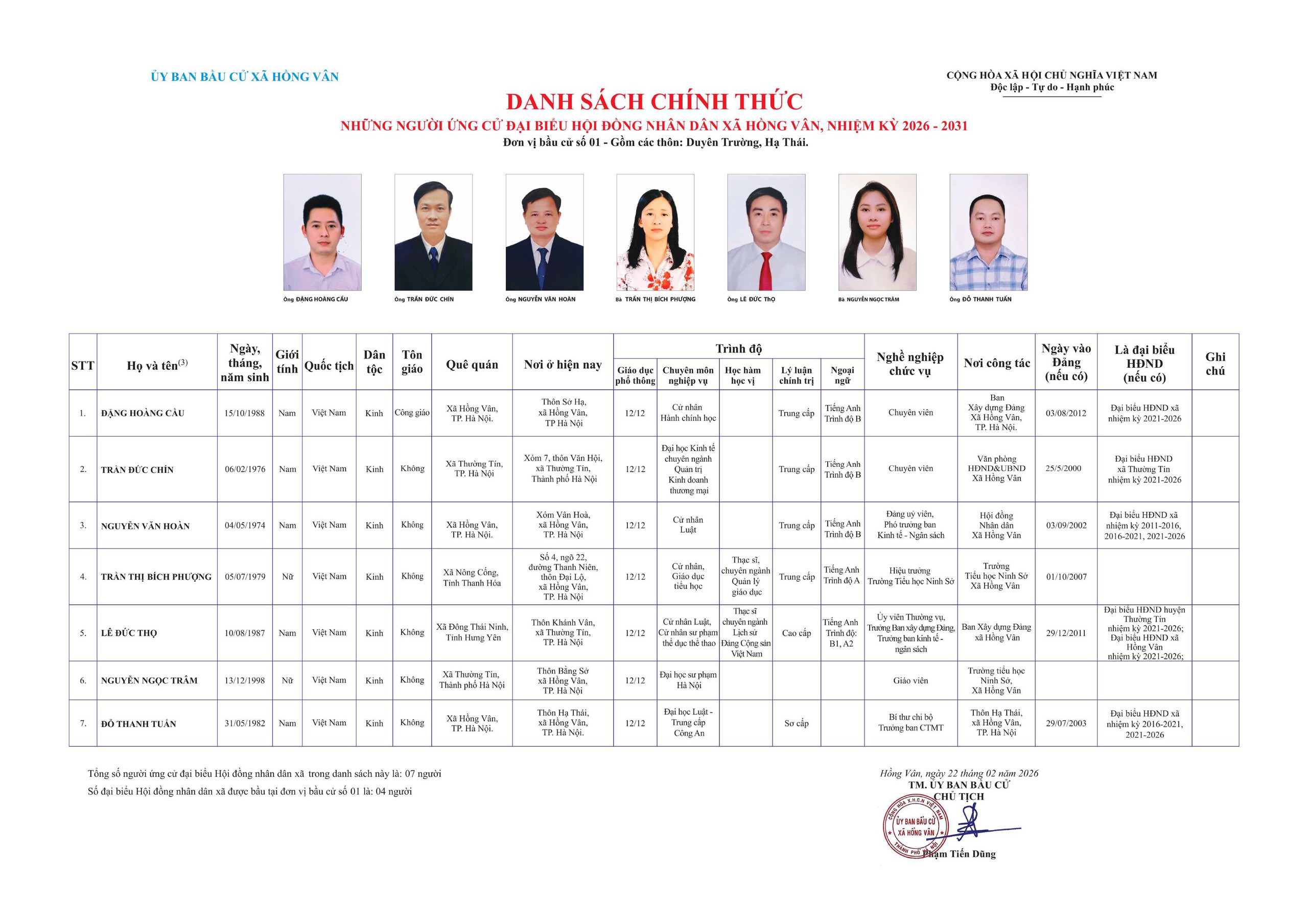 Danh sách người ứng cử HĐND xã Hồng Vân tại đơn vị bầu cử số 01