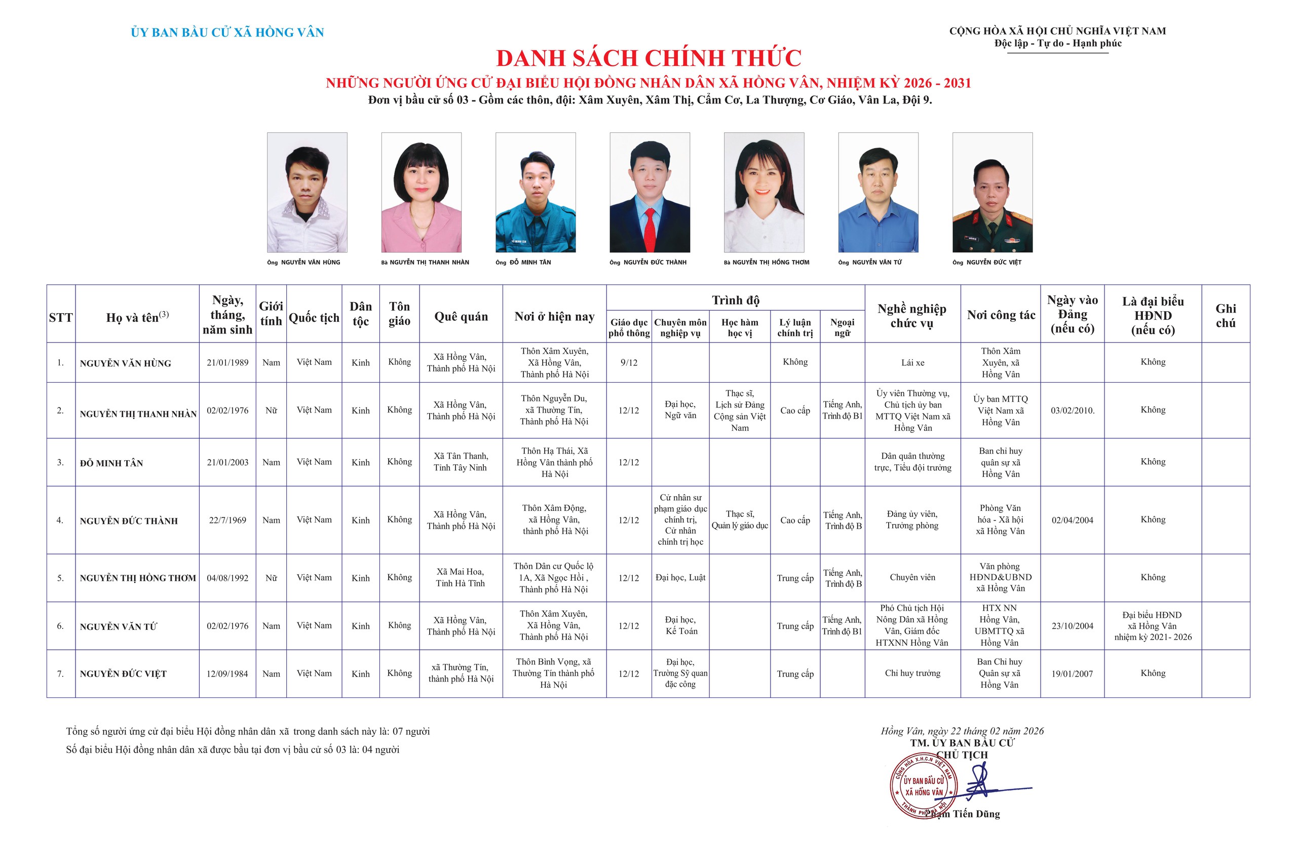 Danh sách người ứng cử HĐND xã Hồng Vân tại đơn vị bầu cử số 03