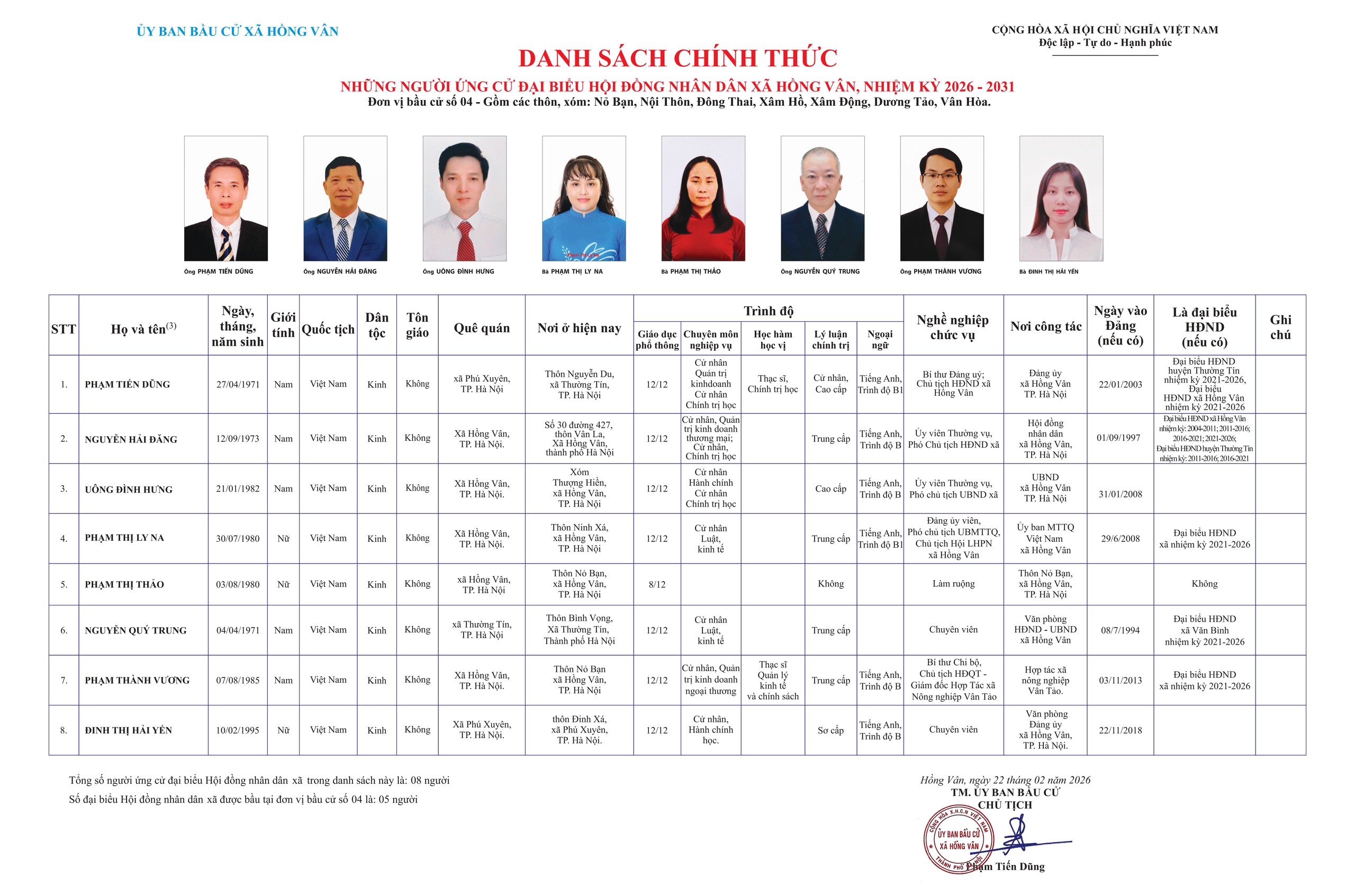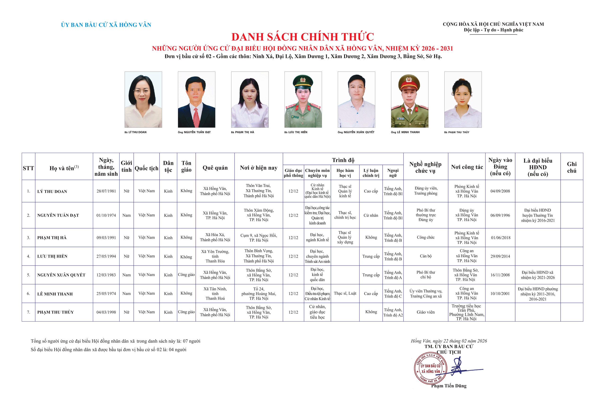Danh sách người ứng cử HĐND xã Hồng Vân tại đơn vị bầu cử số 04