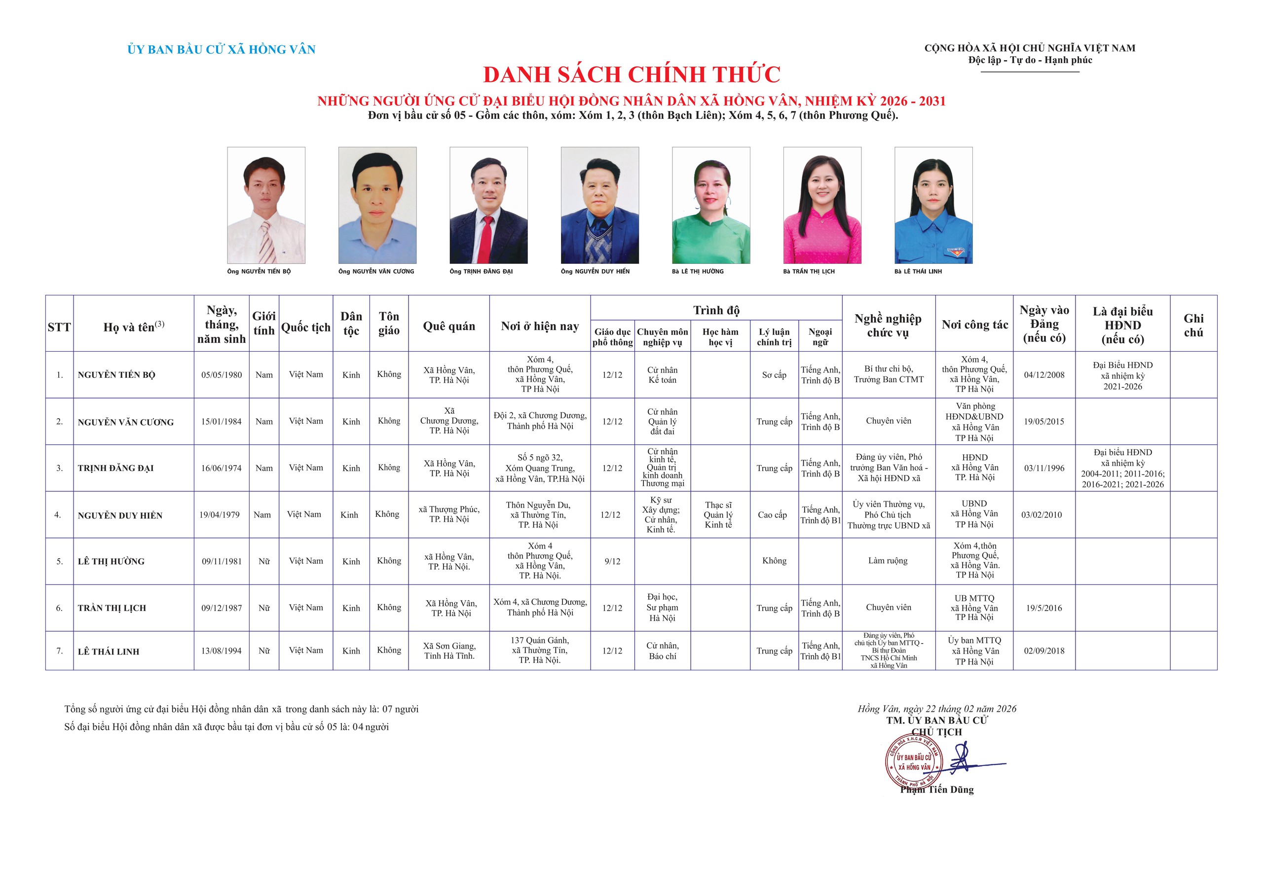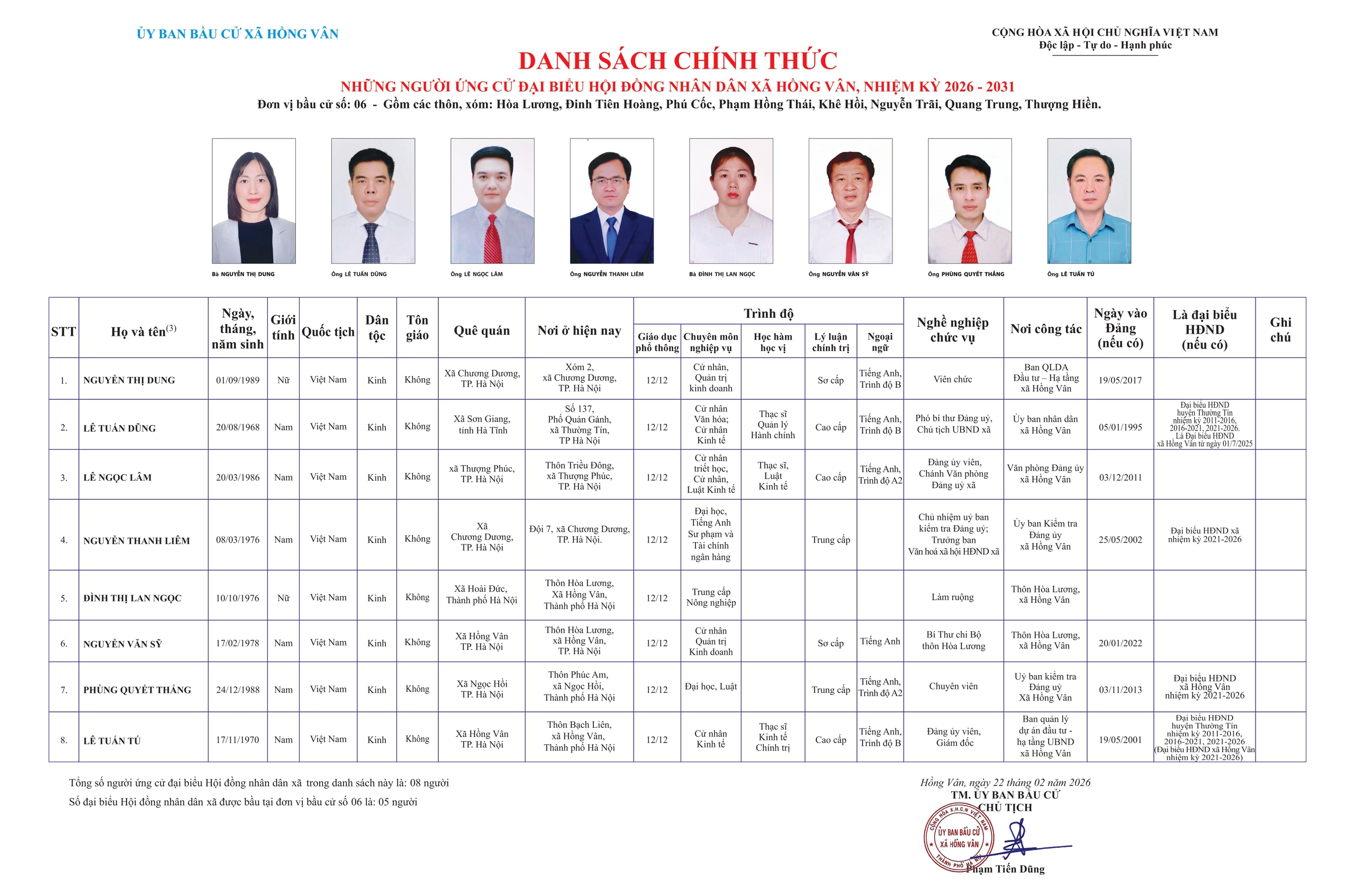 Danh sách người ứng cử HĐND xã Hồng Vân tại đơn vị bầu cử số 06